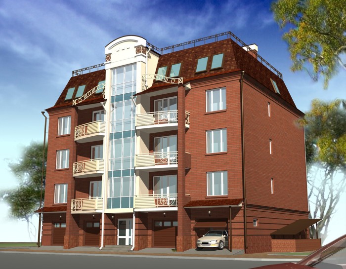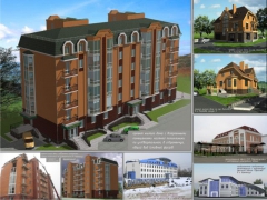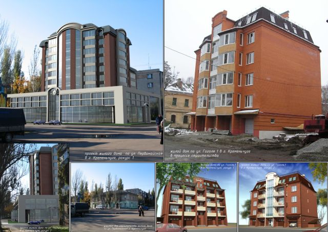 Жилой дом с приблокированным блоком торгово-офисных помещений.Адрес: г. Кременчуг, Полтавской области, ул. Первомайская.Выполненные работы: Комплексное проектирование.